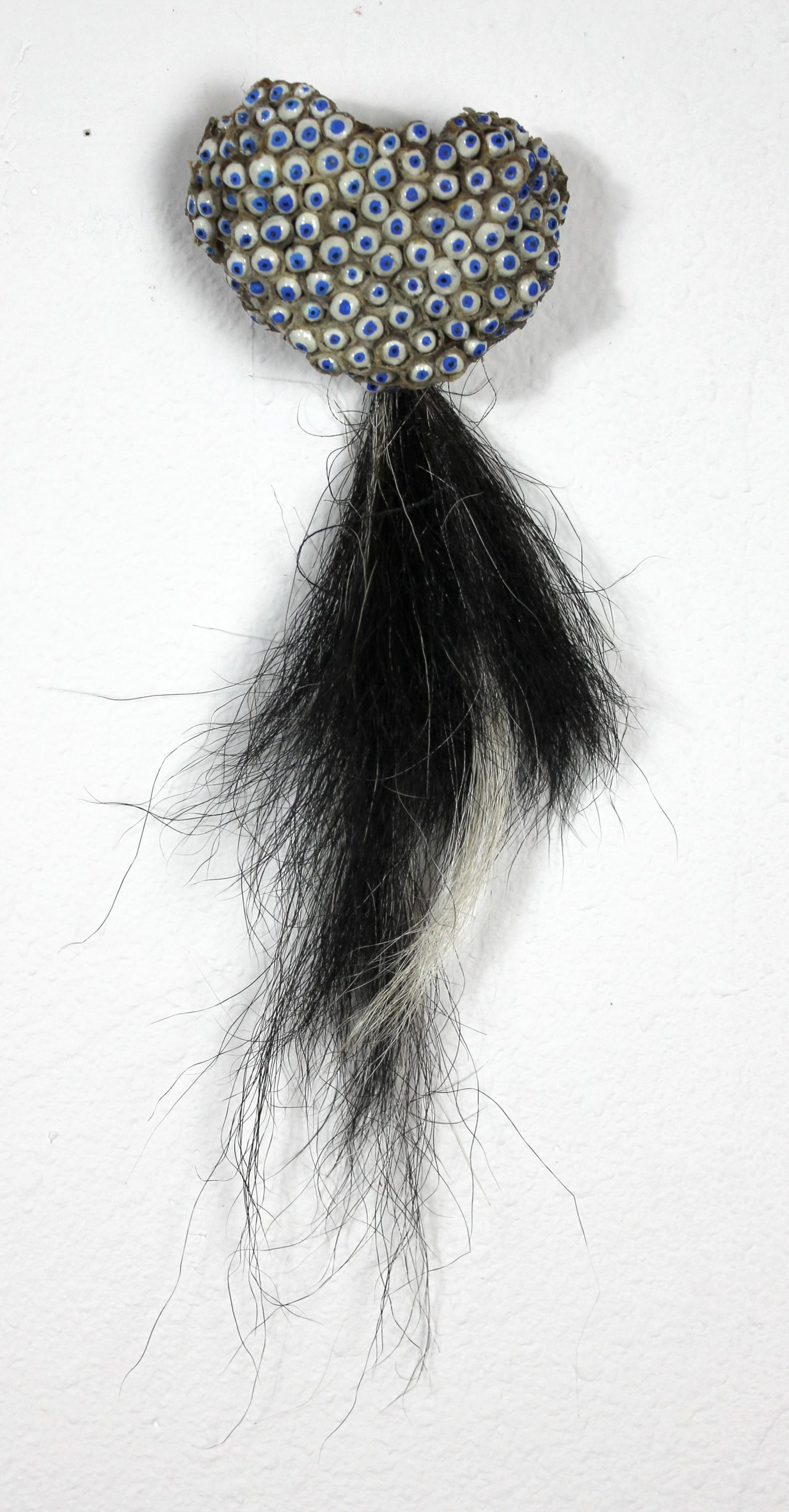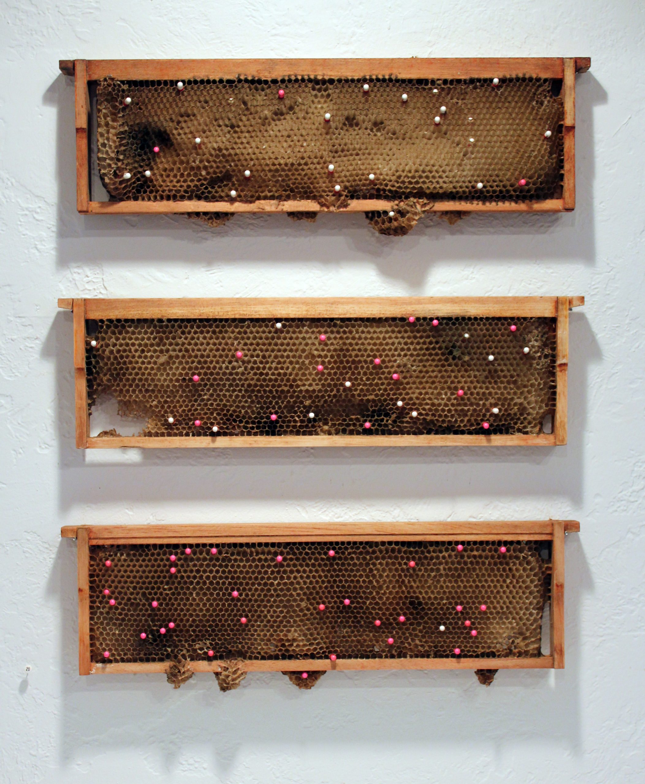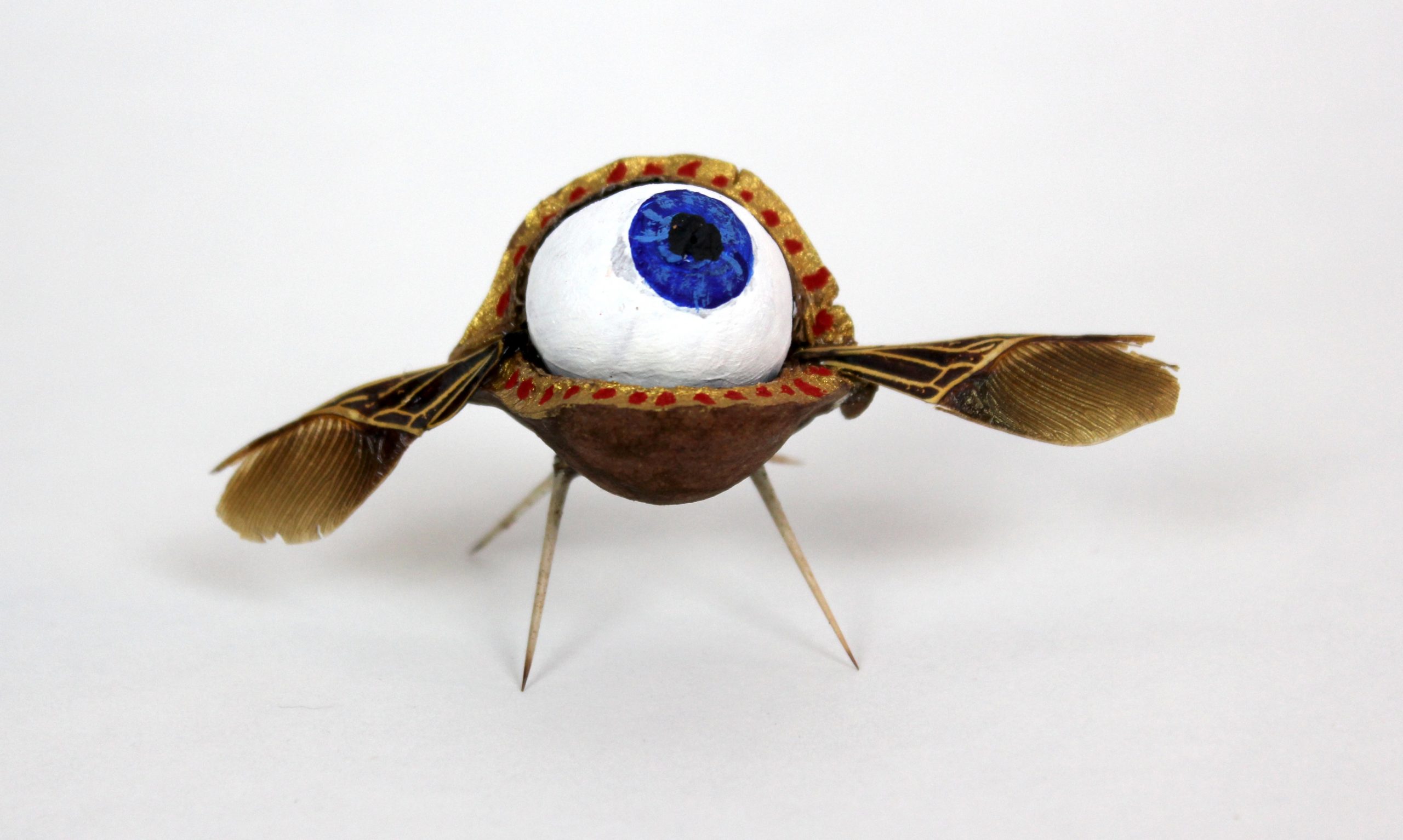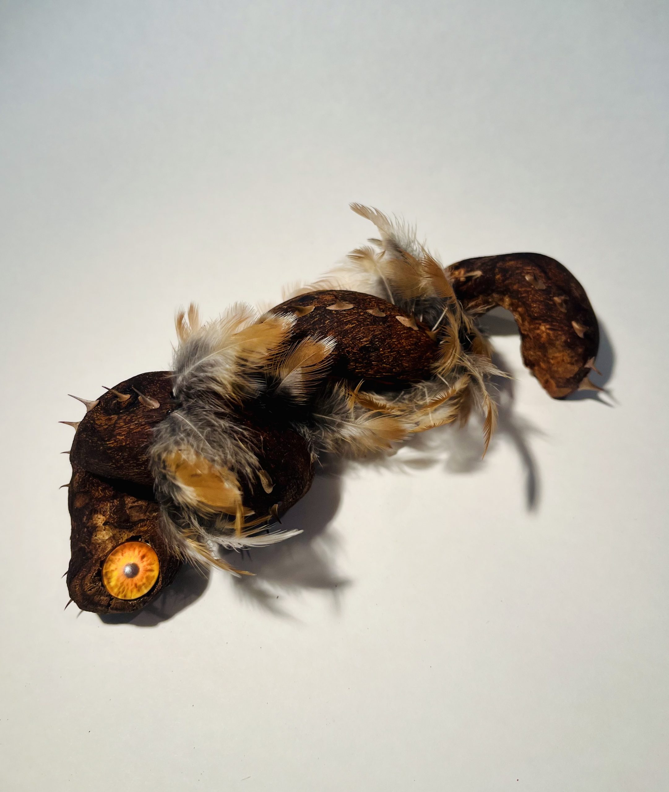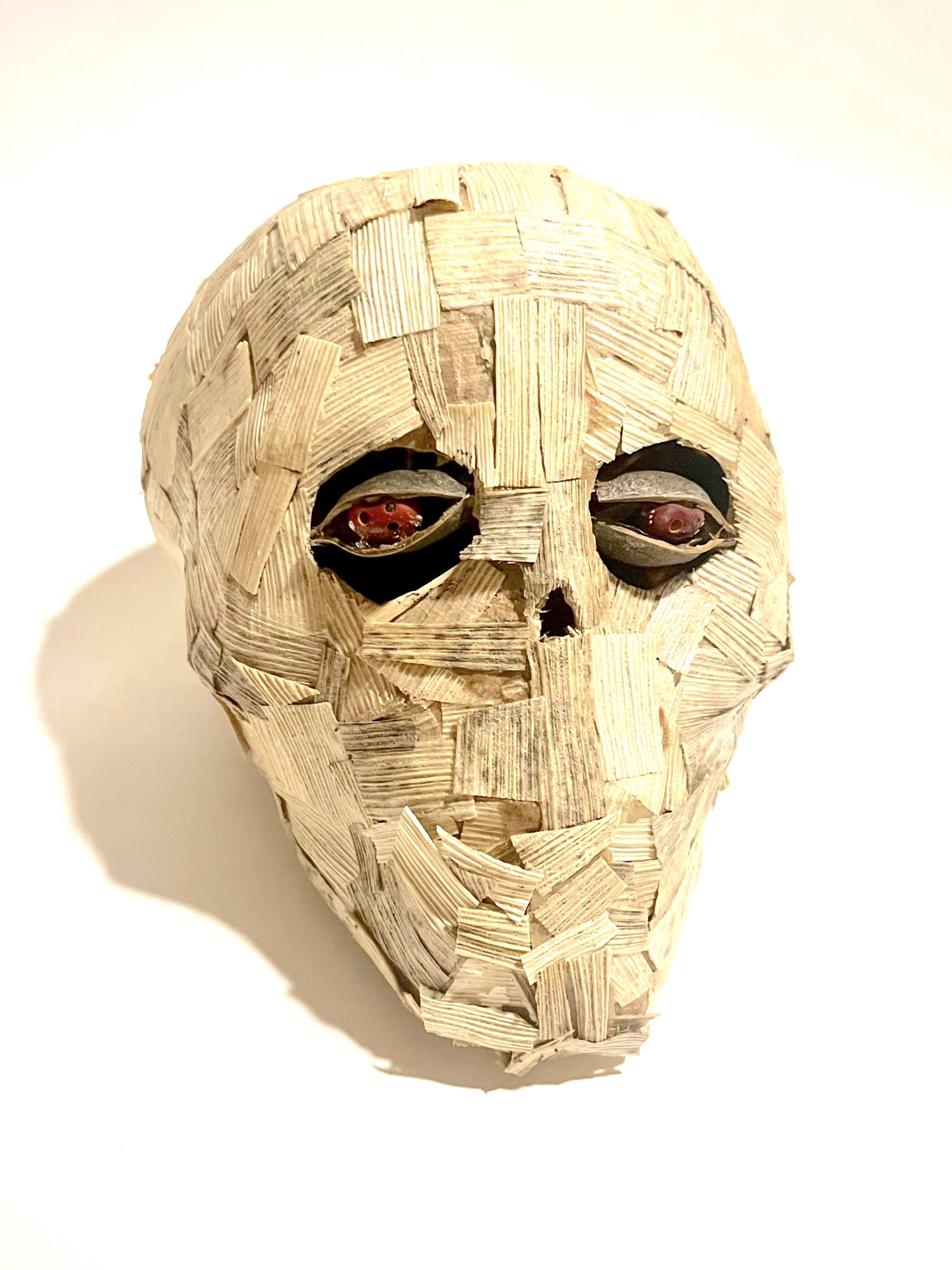 Bible pages, encaustic, feathers, lotus pod, eyeballs