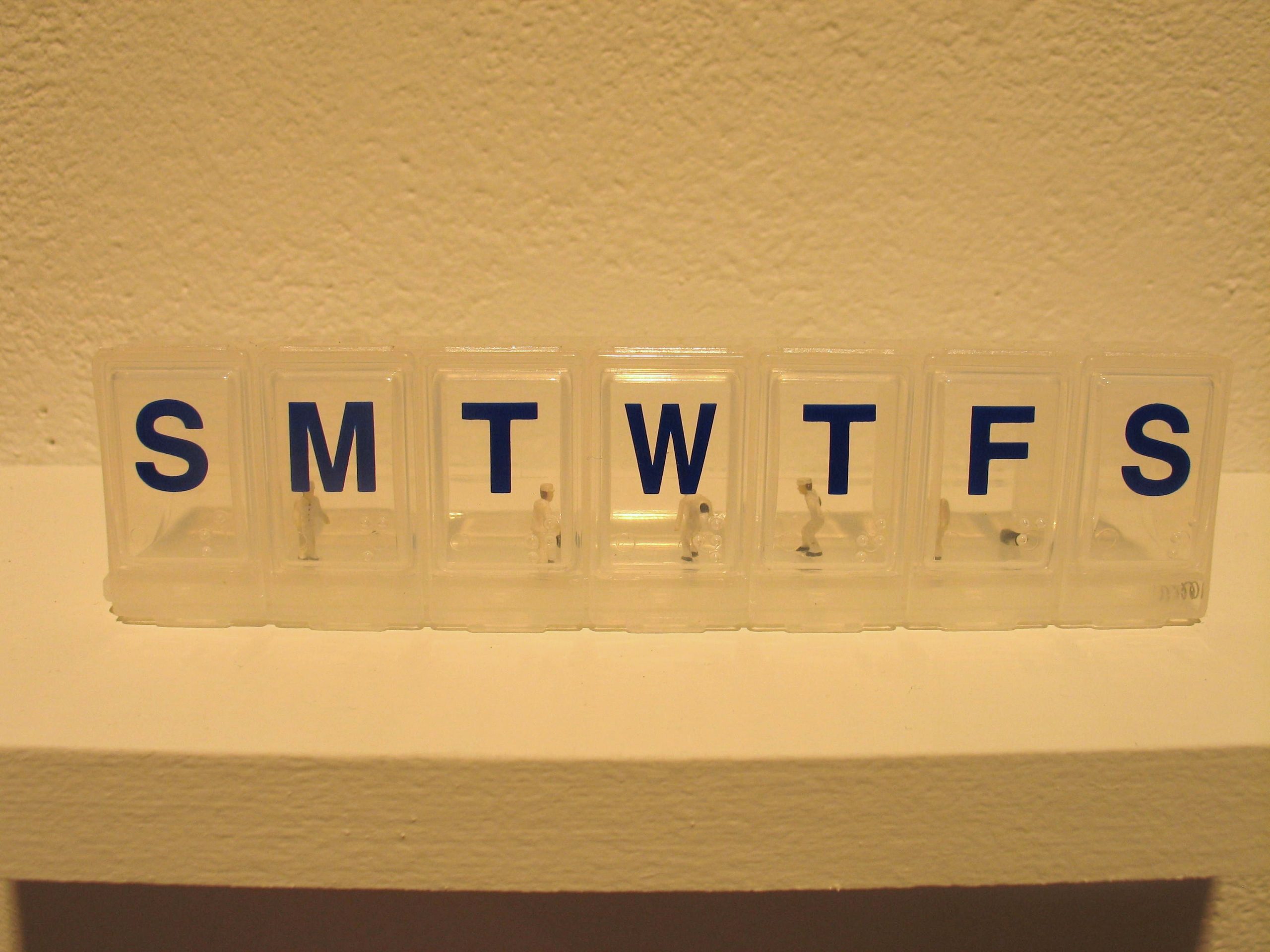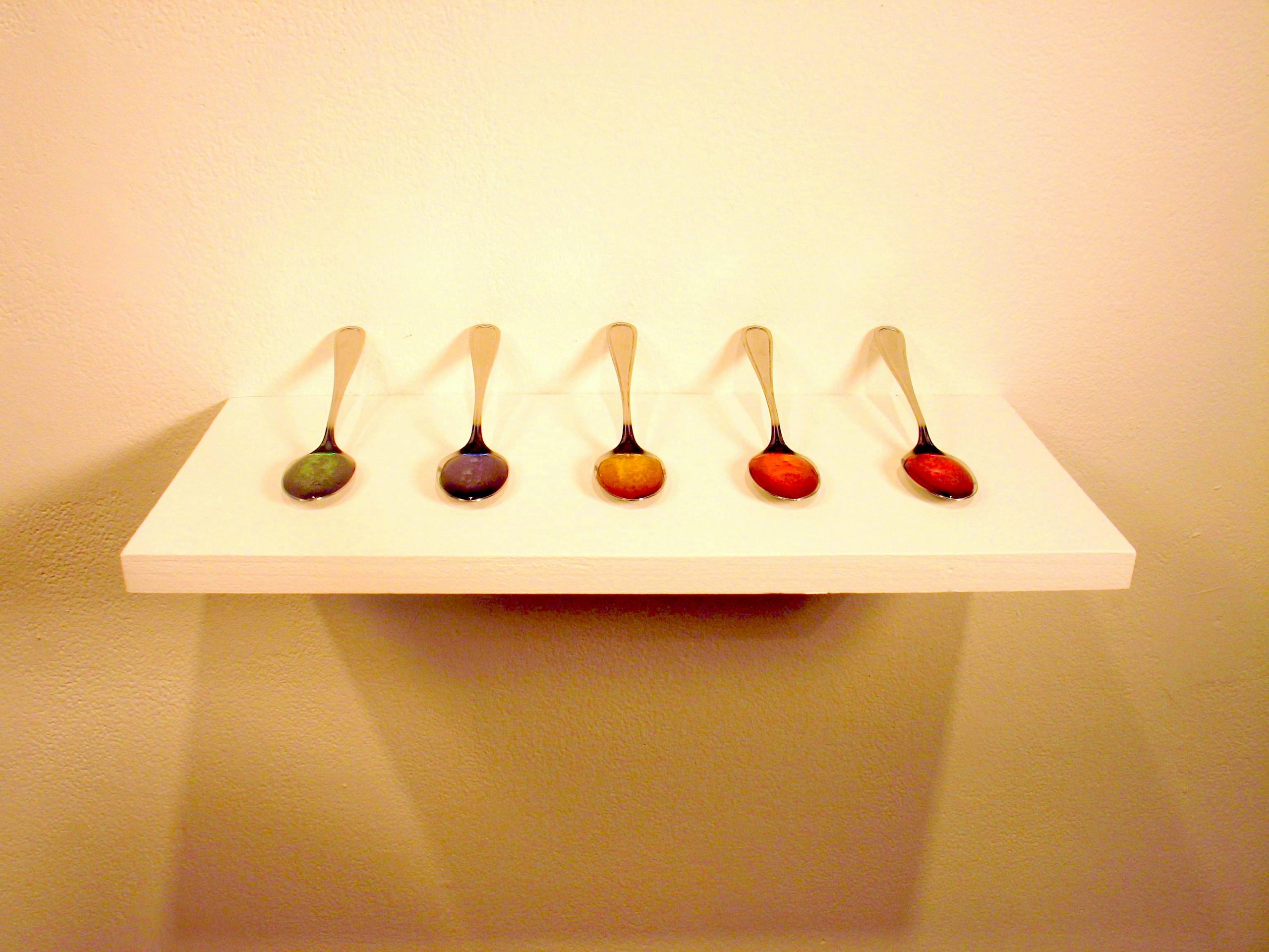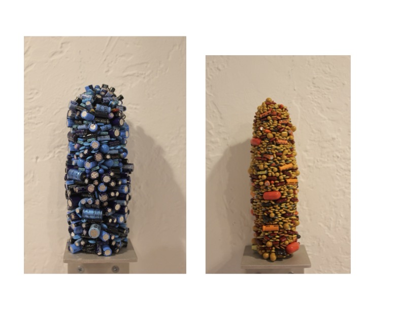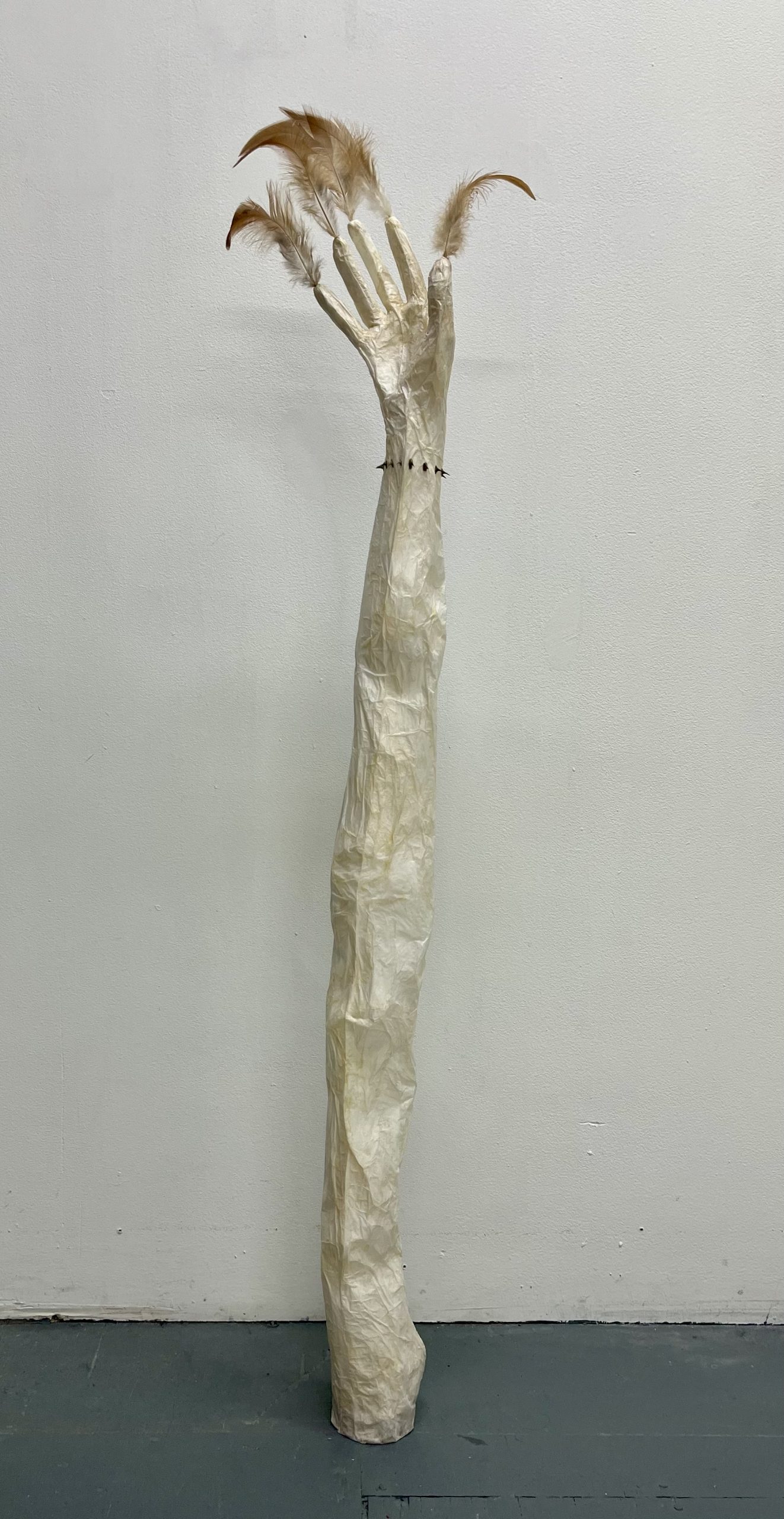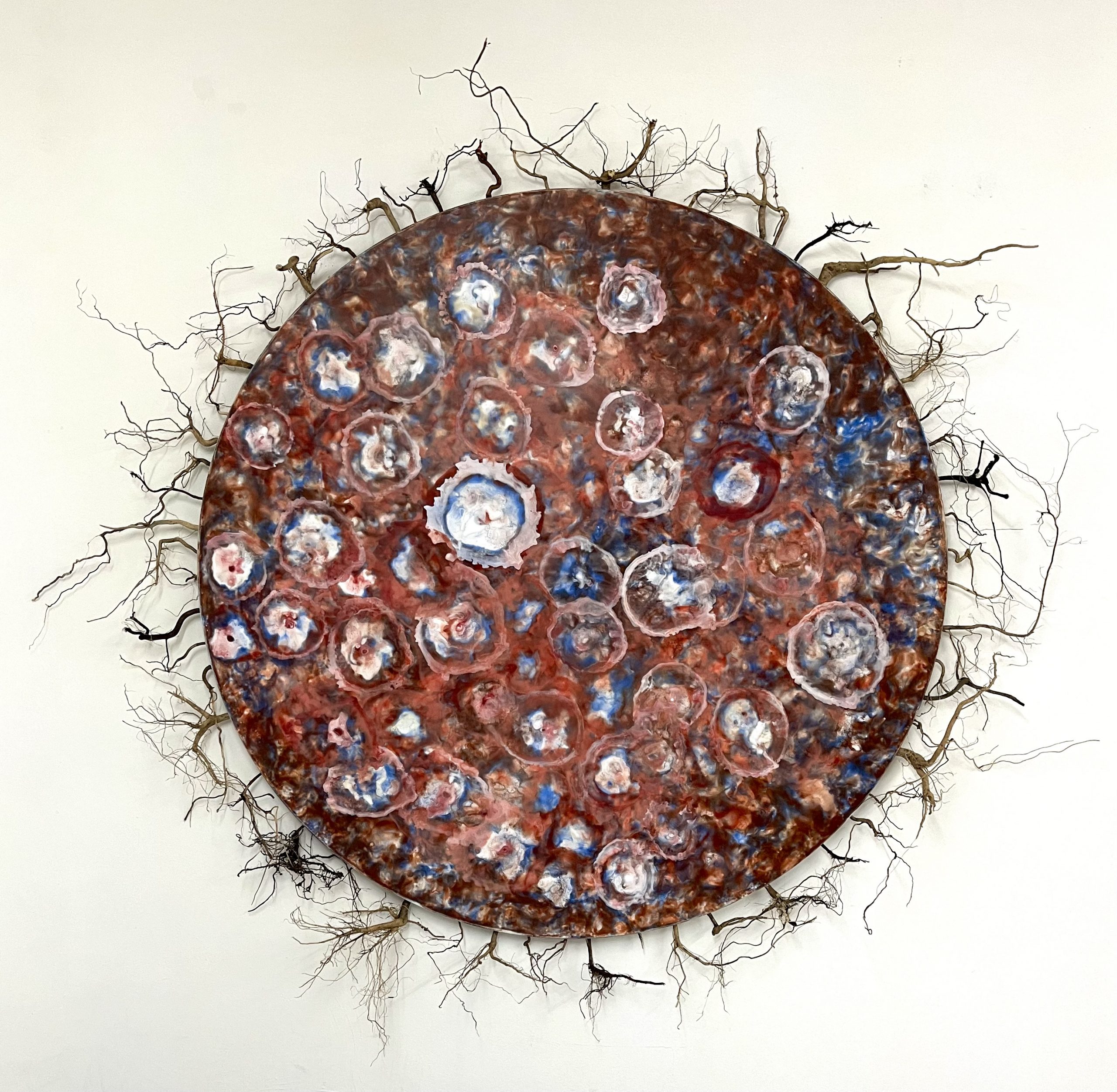 Bible pages, encaustic, feathers, lotus pod, eyeballs